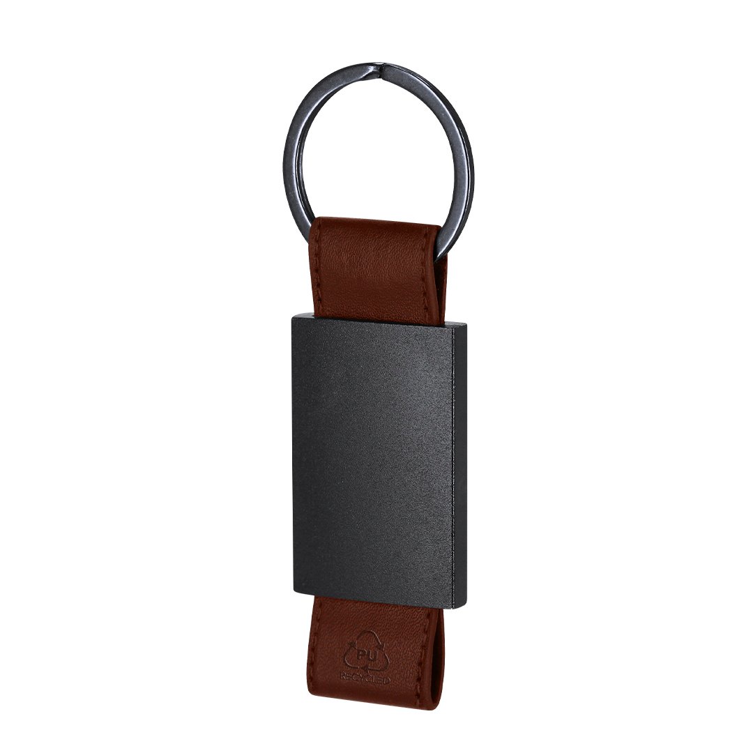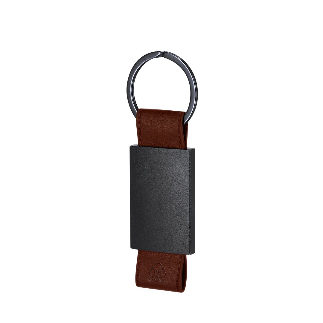 Llavero de divertido diseño con cinta de PU reciclado. Con cuerpo negro en acabado mate.