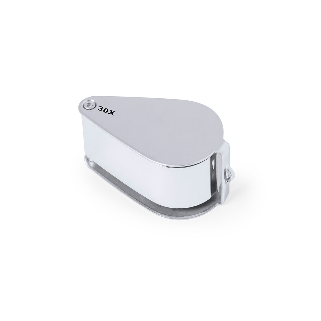 Lupa plegable con aumento 30x fabricada en resistente metal. Con luces LED integradas y gran potencia de aumento para obtener una visión muy cercana de los detalles más pequeños, con ampliación sin distorsión. Ideal para inspeccionar objetos de tamaño reducido, textos, etc. Además, tiene un accesorio para colgar, y viene dentro de un estuche con interior acolchado para una mayor protección. Alimentación a pilas (de botón incluidas), con llave especial para reemplazarlas cuando se agoten. Presentada en caja de cartón negra.