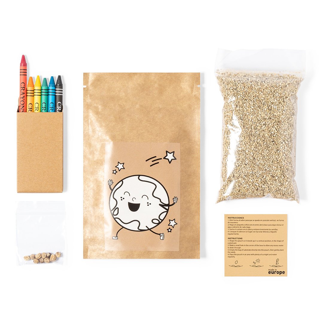 Maceta de línea nature con semillas de capuchina. Presentada en sobre de papel reciclado de diseño, con caja interior de 6 ceras para colorear en estuche de cartón reciclado. Un gadget ecológico que combina el cuidado del medio ambiente con la diversión de colorear.