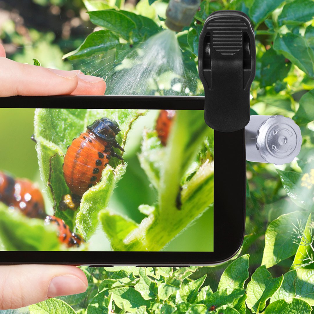 Microscopio para smartphone ajustable a la cámara mediante pinza. Con lentes de aumento de cristal de hasta 60x, 2 ledes y luz ultravioleta para una experiencia de aumento completa. Pilas de botón incluidas. Presentado en una elegante funda de polipiel y en bolsita de tela, todo ello dentro de una atractiva caja de presentación de diseño.