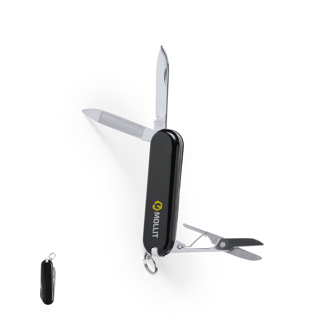 Mininavaja multiusos con accesorios de acero inox, de 6 funciones en variados colores. Incluye navajas, pinzas, lima, palillo, anilla para llavero y tijeras. Presentada en caja individual.