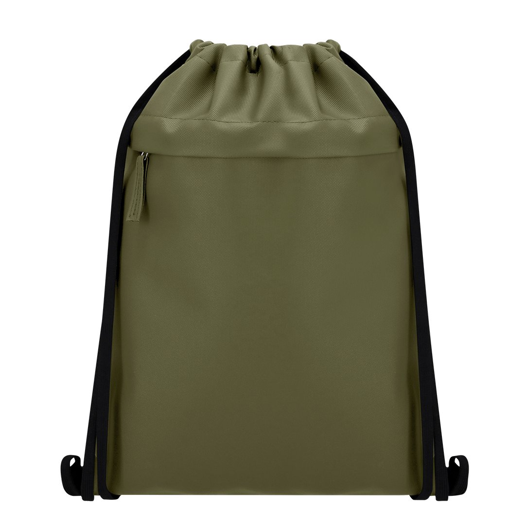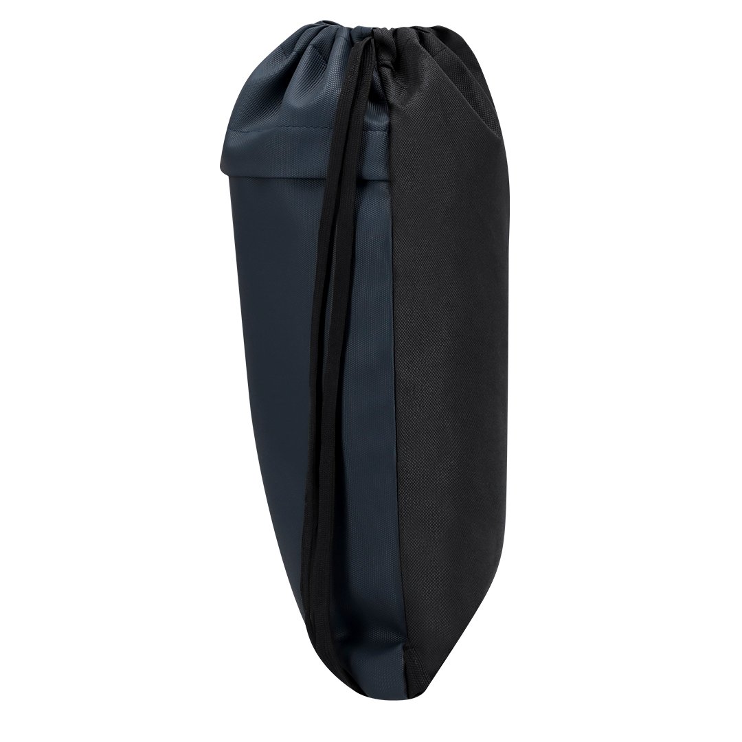 Mochila de cuerdas fabricada en suave PU combinado con resistente poliéster 600D. Incluye funcional bolsillo frontal con cierre de cremallera y tirador a juego en PU.