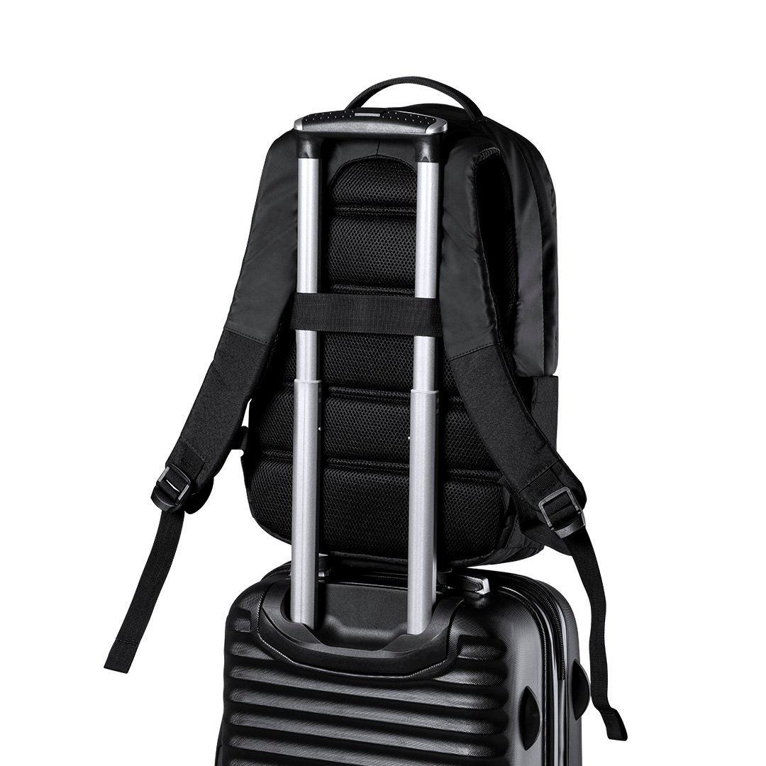 Mochila de Antonio Miró de calidad premium en resistente poliéster 600D de sobrio diseño en color negro. Con cierre de cremallera, bolsillo frontal y asa reforzada metálica. Con acolchado ergonómico en espalda y cintas de hombros, incluye compartimento interior acolchado para portátil de hasta 15 pulgadas y para tablets de hasta 10 pulgadas. Fundas interiores para bolígrafos y smartphone. Con logotipo de la marca en frontal.