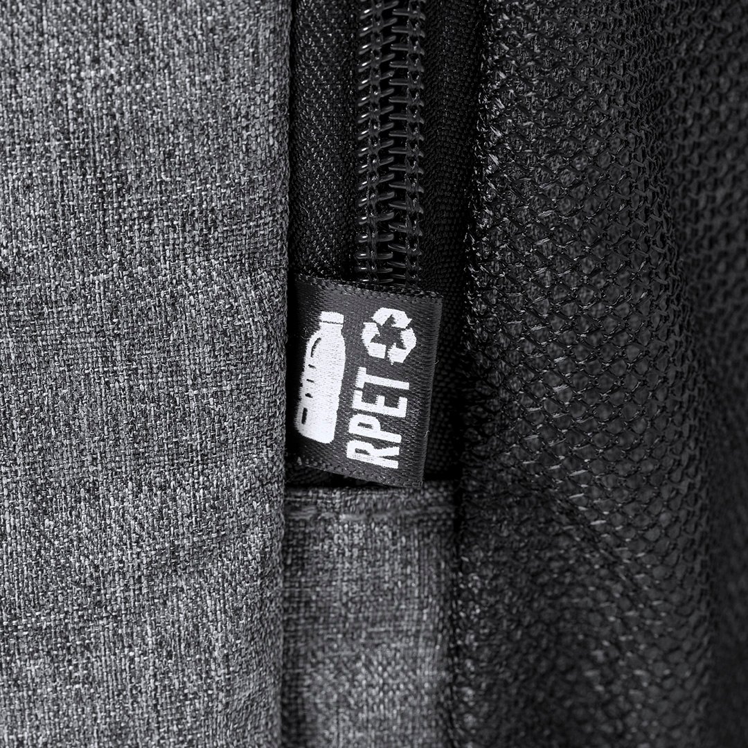 Mochila nevera 10L de línea nature, fabricada en resistente poliéster RPET 600D de alta calidad, elaborado a partir de plástico reciclado para así fomentar la reutilización de residuos plásticos y contribuir a la sostenibilidad del planeta. Compartimento principal con cierre de cremallera de doble tirador, con interior en PEVA. Con bolsillos laterales en redecilla y bolsillo frontal de acceso rápido con cierre de cremallera y tirador. Banda elástica en la parte superior, y en bolsillo en la parte trasera.Totalmente acolchada. Distintivo RPET en etiqueta.