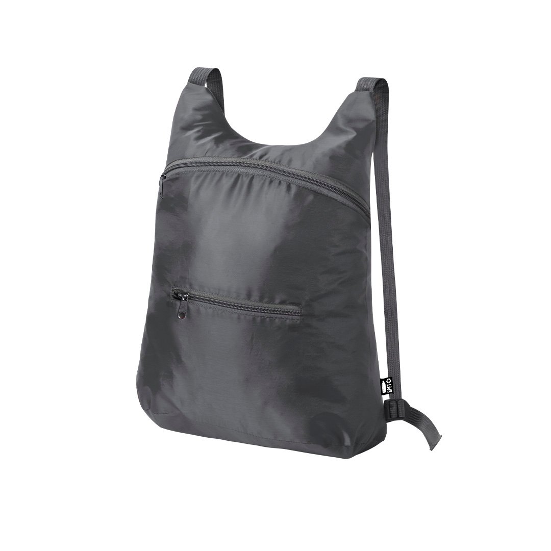 Mochila plegable en suave poliéster 201D RPET, elaborado a partir de plástico reciclado, para así fomentar la reutilización de residuos plásticos y ayudar a la sostenibilidad del planeta. Con cierre de cremallera y bolsillo frontal. Esquinas reforzadas, cintas de hombros regulables y accesorios en color gris. Plegado de pequeño tamaño, con cinta de transporte y disponible en variada gama de colores. Distintivo RPET en etiqueta.