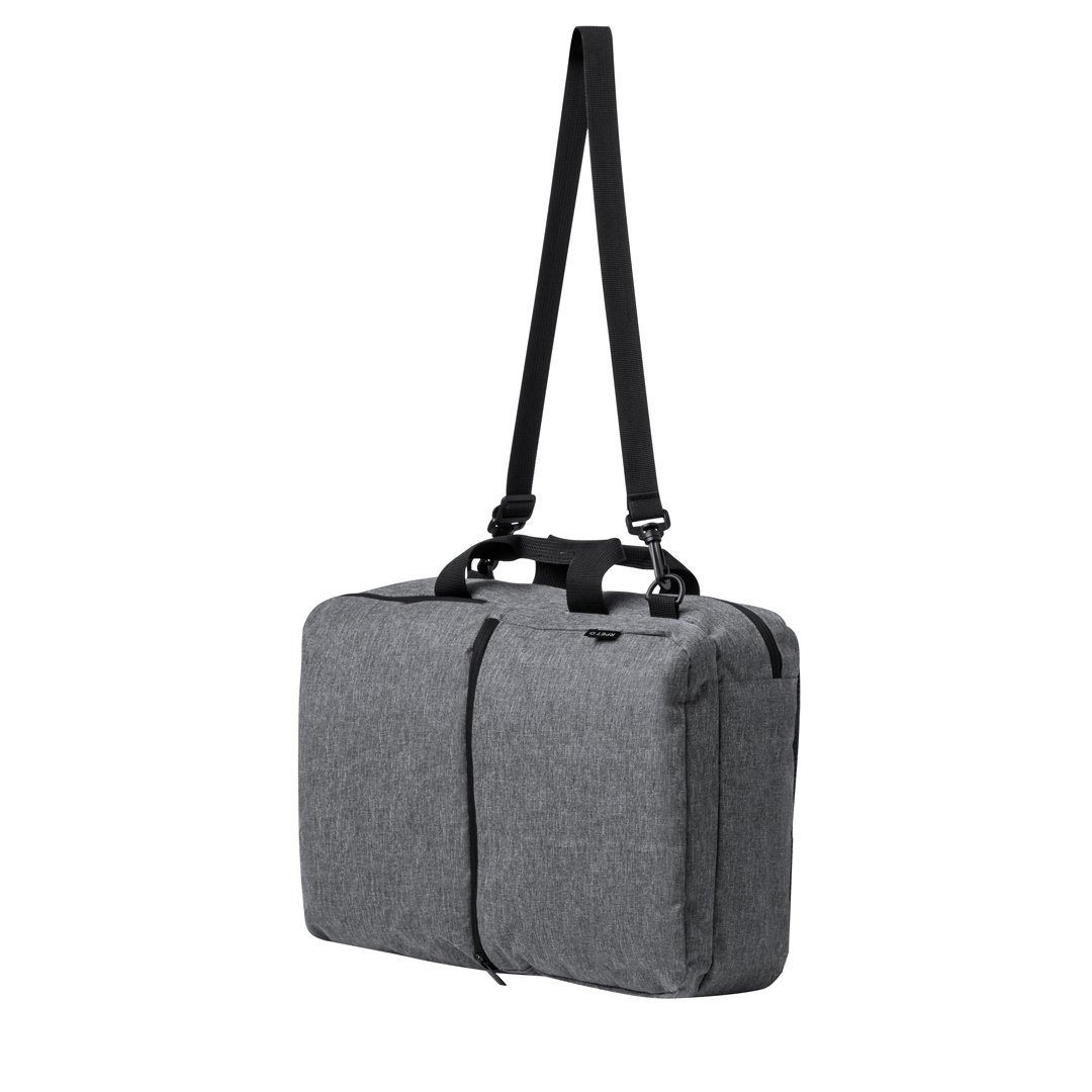 Mochila portadocumentos confeccionada en resistente 600D RPET. Presenta un diseño urbano que incorpora un bolsillo central con cierre de cremallera, y doble tirador. Con interior acolchado para portátil de hasta 15 pulgadas, bolsillo adicional con cierre de doble cremallera y bolsillo frontal. Sus cintas de hombros y la espalda están acolchadas y son ajustables para mayor comodidad. Ofrece tres modalidades de transporte: como mochila, gracias a las tiras de hombros colchadas; como portadocumentos, gracias a su asa de transporte acolgada; y como bandolera gracias a su asa larga ajustable. Está disponible en tres elegantes colores y se presenta de manera sofisticada en una bolsa individual reciclada.El material RPET se elabora a partir de plástico reciclado, para así fomentar la reutilización de residuos plásticos y ayudar a la sostenibilidad del planeta.