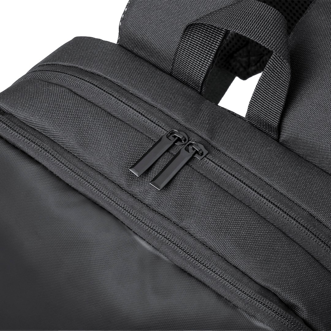 Mochila confeccionada en elegante polipiel. De diseño urbano que incluye un bolsillo central acolchado con doble cierre para tablet de hasta 10 pulgadas y portátil de hasta 15 pulgadas, así como un bolsillo segundario. Además, tiene un bolsillo frontal con cremallera y solapa protectora. Las cintas de hombros y la espalda son acolchadas, ajustables y cuentan con una tela transpirable. Incorpora un accesorio para ajustarse al trolley y una cómoda asa en la parte superior. Presentada en una bolsa individual reciclada.