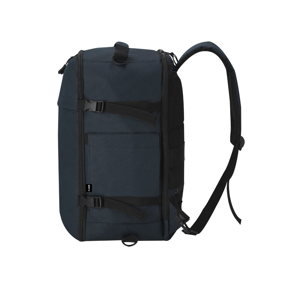 Mochila multifunción fabricada en poliéster 600D RPET. Cuenta con una excelente transpirabilidad en la zona trasera y en la cinta para los hombros, facilitando la disipación del calor gracias a sus cintas y respaldo acolchados. Las cintas anchas están diseñadas para aliviar la presión en los hombros, permitiendo llevar la mochila cómodamente durante largos periodos.Perfecta para cualquier situación por tener múltiples compartimentos.Bolsillo principal para guardar ropa y/o complementos con organizador en su interior, y dos más acolchados, perfectos para llevar portátil de hasta 15 pulgadas.2 compartimentos frontales, y un bolsillo antirrobo, Además, cuenta con un bolsillo lateral perfecto para tener acceso rápido. Perfecta para viajes o para el día a día por sus cintas ajustables, adaptándose a todo estilo de vida.