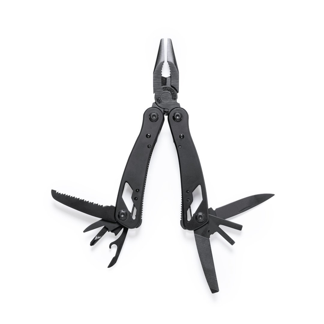Multiherramienta con accesorios en acero inox de acabado negro y resistente empuñadura a juego en aluminio. Con 13 funciones, entre ellas cuchillo y navaja destornillador, lima abridor y alicates. Plegable y de tamaño compacto, presentada en caja individual de diseño negra.