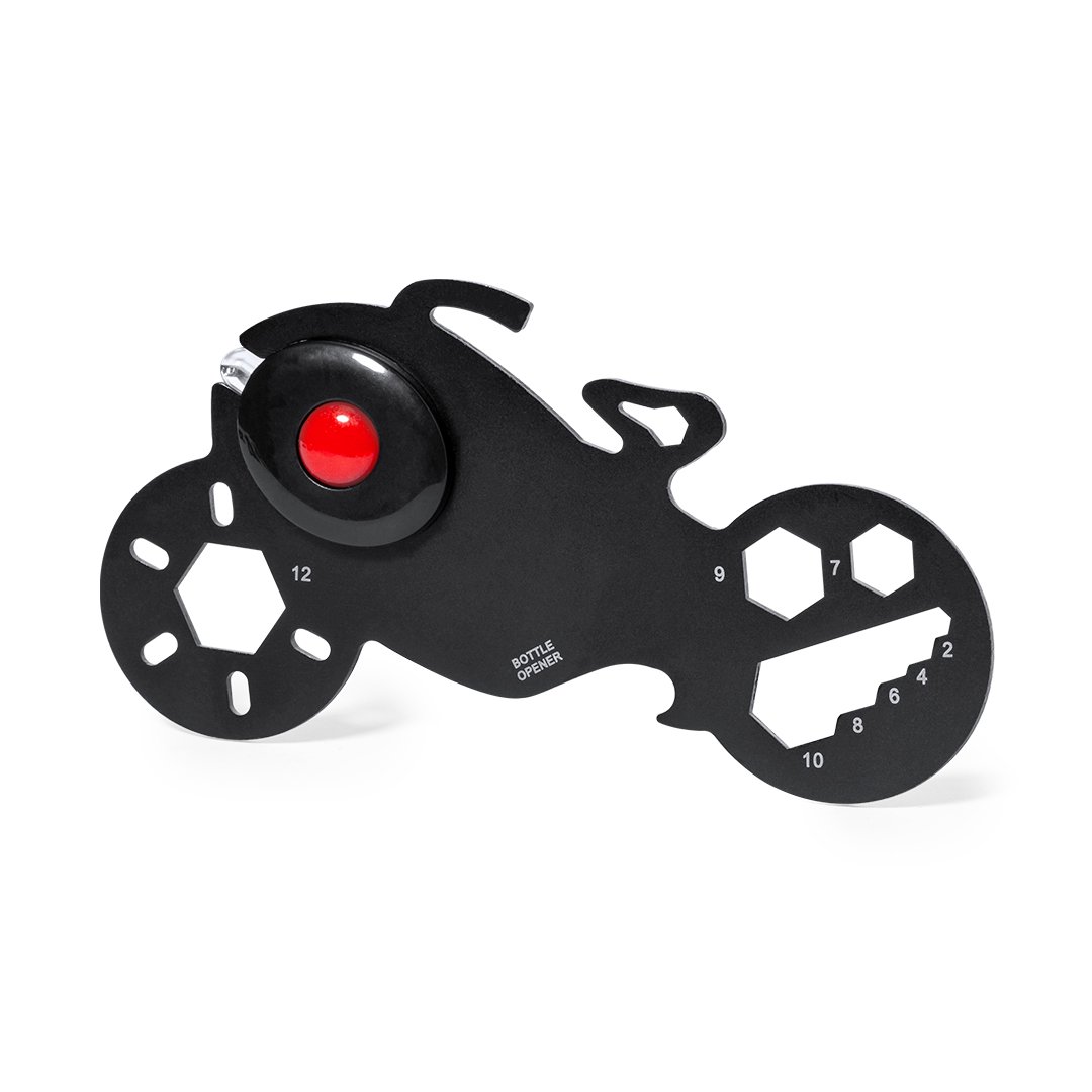Original y práctica multiherramienta en acero inox con forma de motocicleta. Con 11 funciones, entre otras: llave para tuercas hexagonales en varios tamaños y abrebotellas. Además, con linterna de 1 LED alimentada por pila de botón. Presentado en bolsa de papel reciclada.