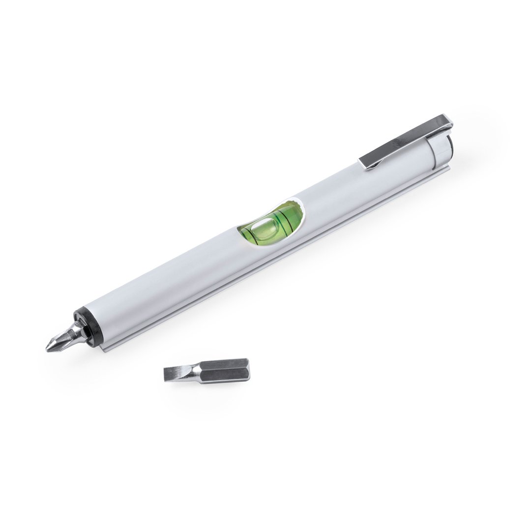 Práctica multiherramienta fabricada en aluminio, con nivel integrado en el cuerpo y dos cabezales para destornillador (plano y philips) en el interior. Con clip metálico de acabado cromado y presentada en caja de diseño kraft.