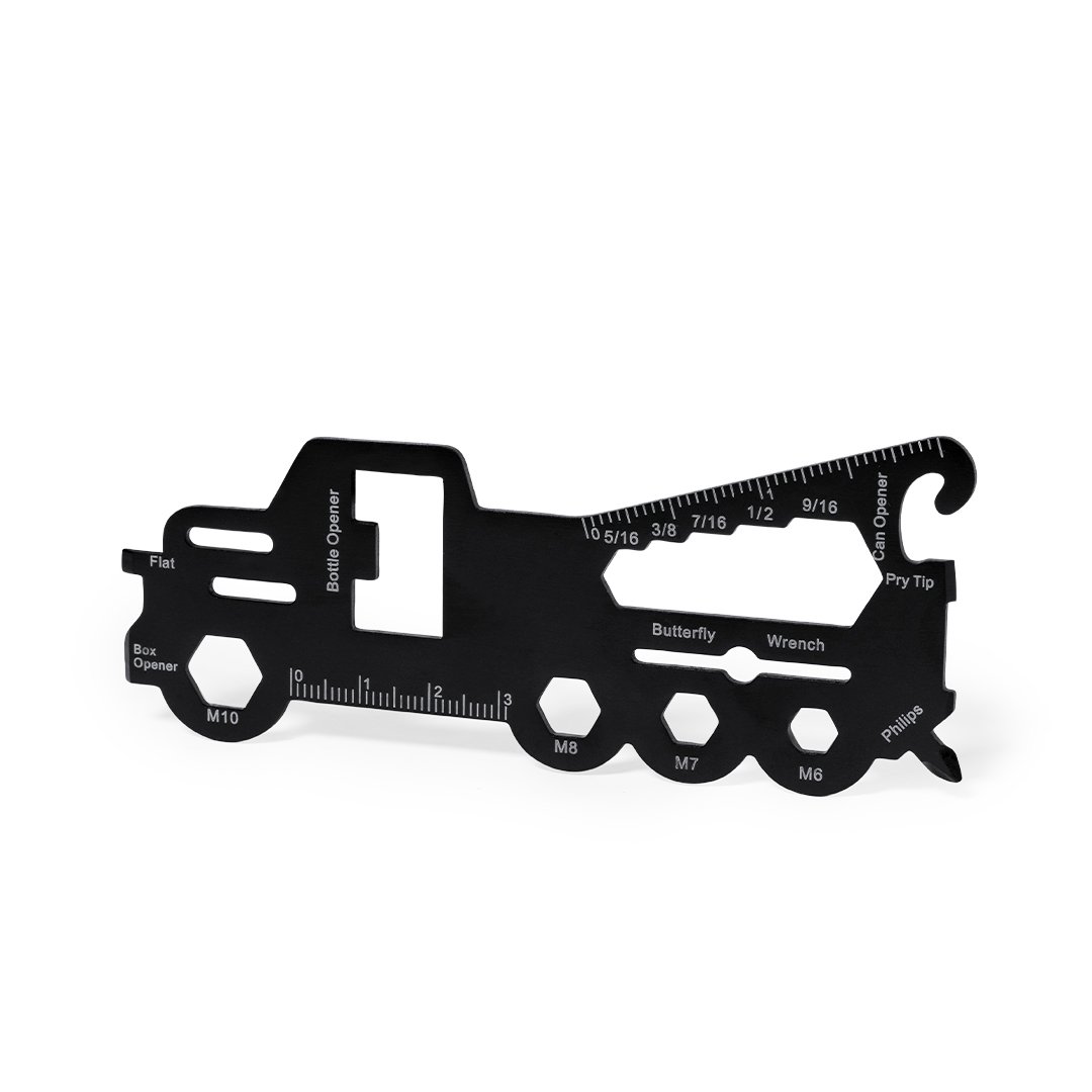 Original y práctica multiherramienta en acero inox con forma de camión. Con 18 funciones, entre otras: destornillador de punta plana y philips, llave para tuercas hexagonales en varios tamaños, regla, abridor de cajas y abrebotellas. Presentado en bolsa de papel reciclada.