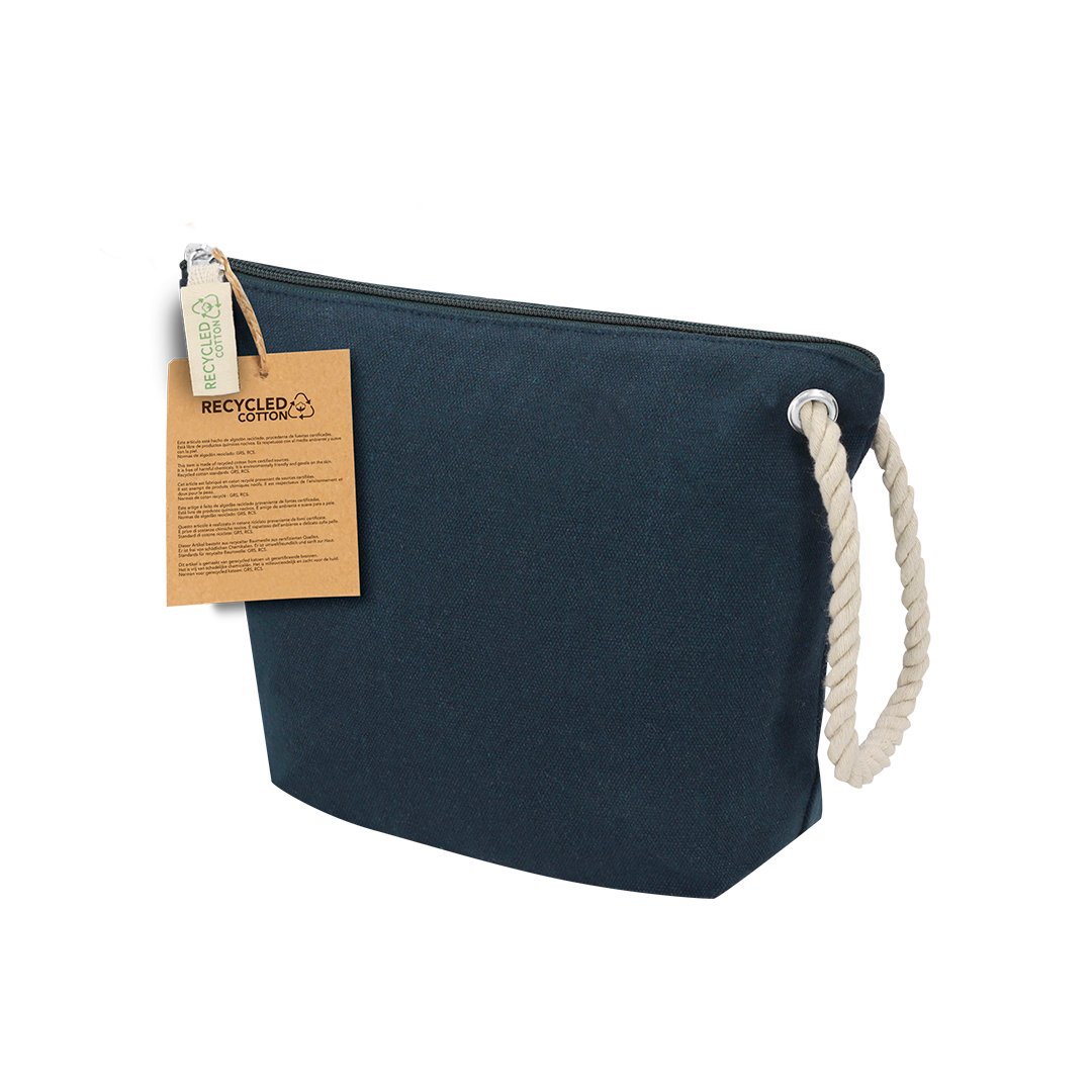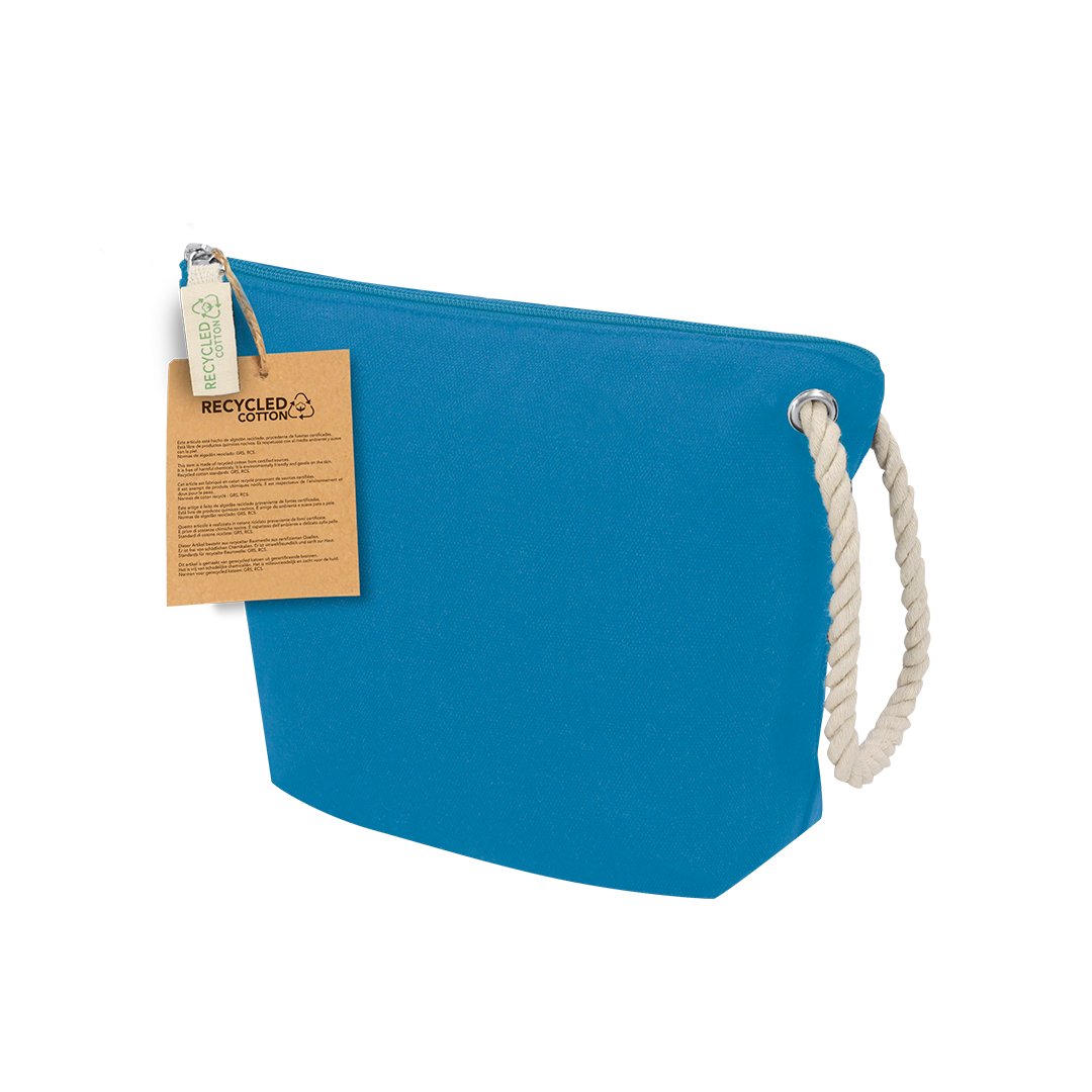 Neceser fabricado principalmente en algodón reciclado 240 g/ m2. Compartimento principal con cierre de cremallera. Con original cordón para fácil transporte unido mediante una argolla plateada. Incluye etiqueta exterior con logotipo algodón reciclado.