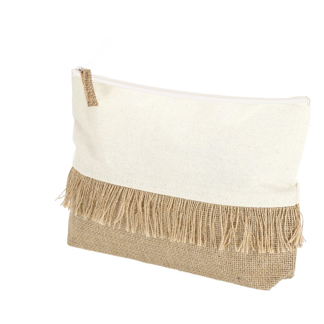 Neceser en combinación de yute laminado y algodón natural. Con distintivos flecos, cierre de cremallera en color natural y tirador de yute.