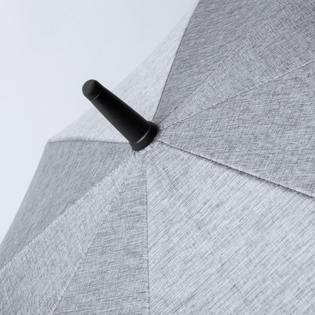 Paraguas de alta calidad y 130cm de diámetro, fabricado en material poliéster 150D y en elegante tono gris jaspeado. Apertura automática y varillas de fibra de vidrio, con sistema antiviento y cierre de velcro. Con mango ergonómico en suave ABS y presentado en bolsa reciclada.
