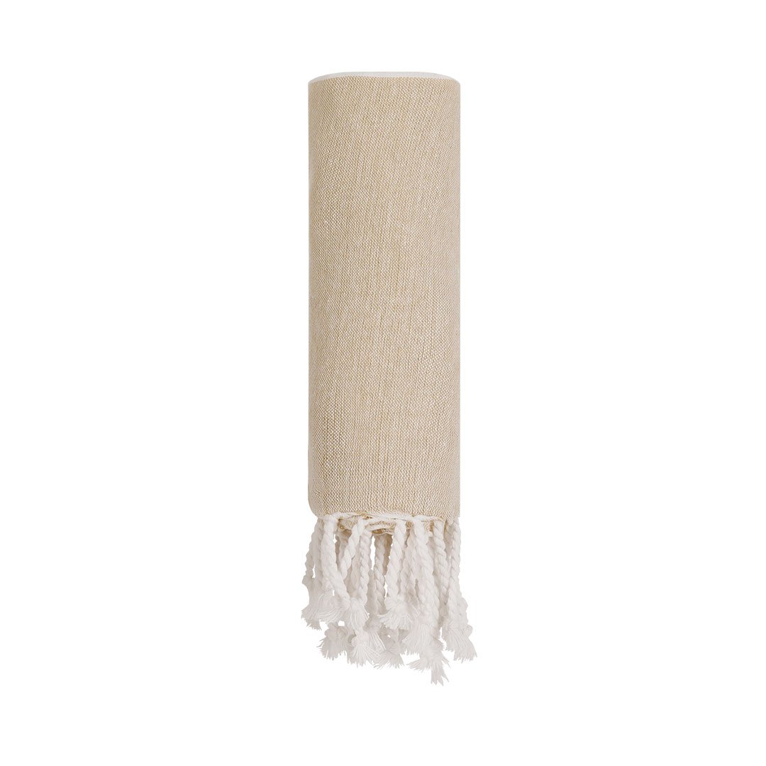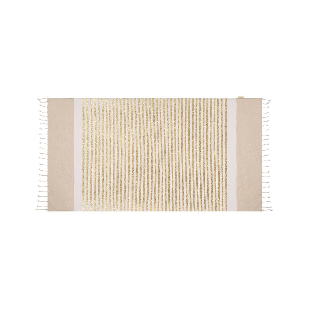 Pareo Toalla en algodón reciclado de 180g/m2. Diseño a rayas color blanco en combinación con rayas doradas con efecto glitter, extremos en beige liso y distinguidos flecos en los extremos en forma de cordón. Incluye etiqueta con distintivo algodón reciclado.