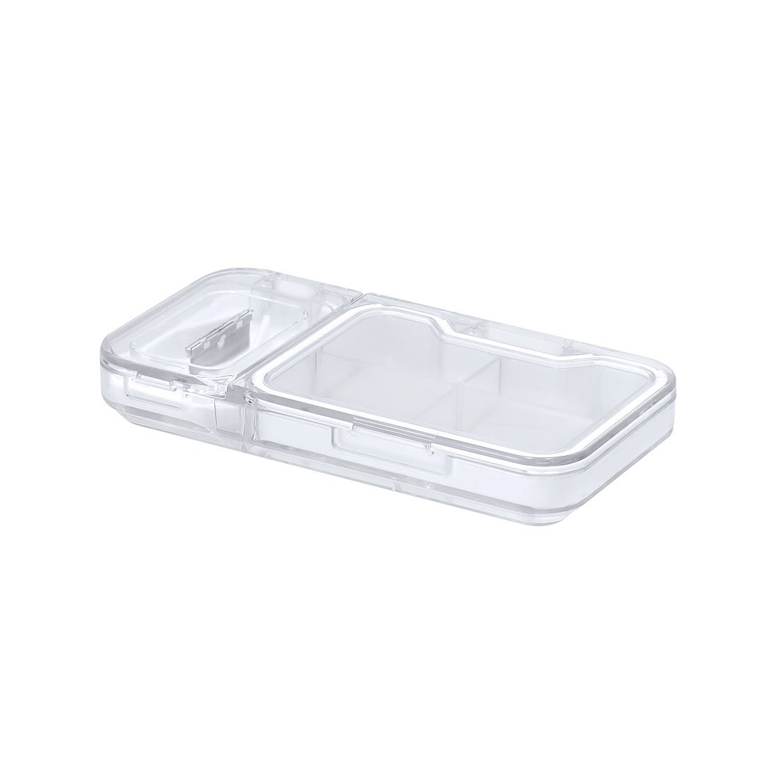 Pastillero con 4 compartimentos interiores, cierre de seguridad con bordes de silicona y cuchilla para partir pastillas. Fabricado con un acabado transparente.