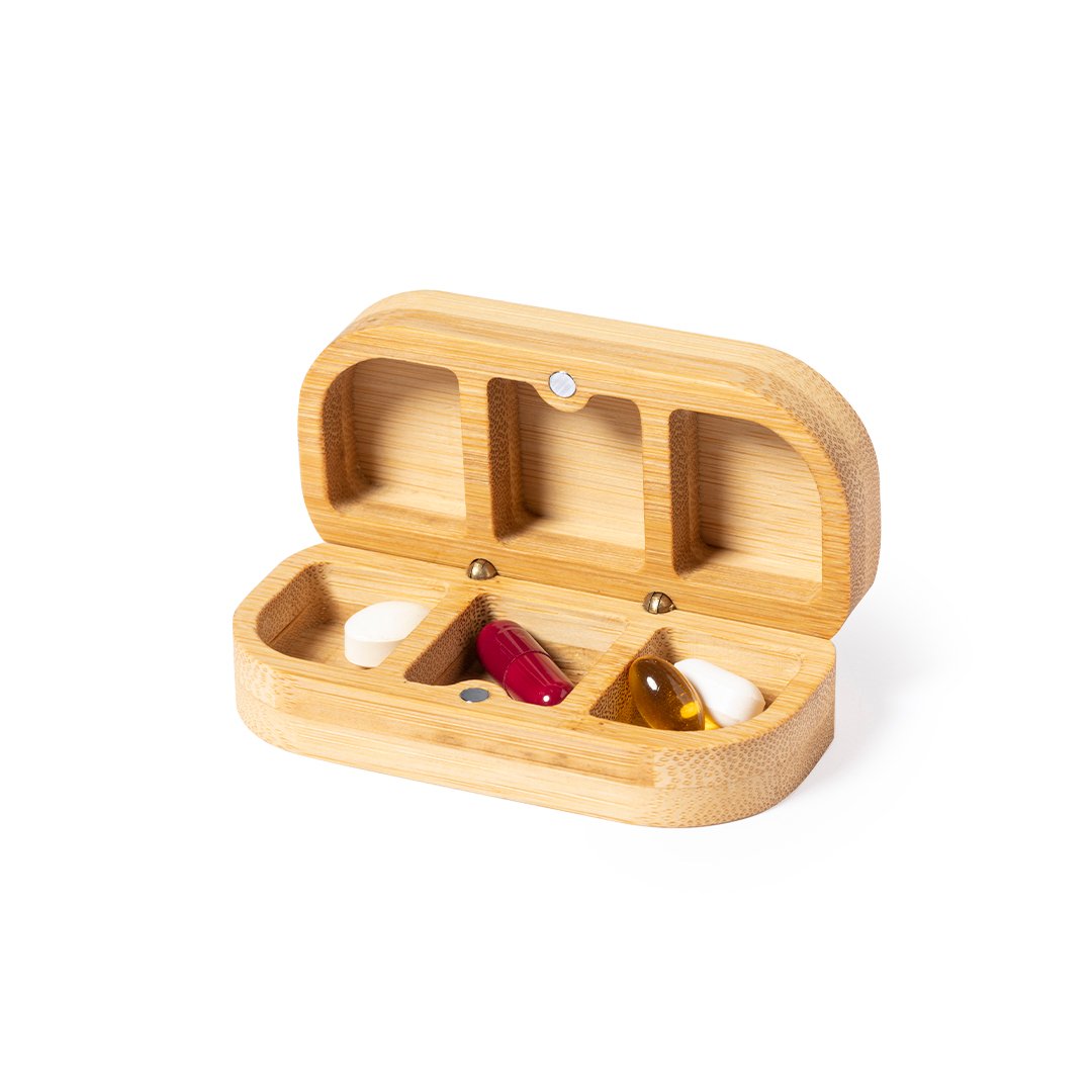 Pastillero de línea nature fabricado en bambú. Con 3 compartimentos interiores y cierre magnético.