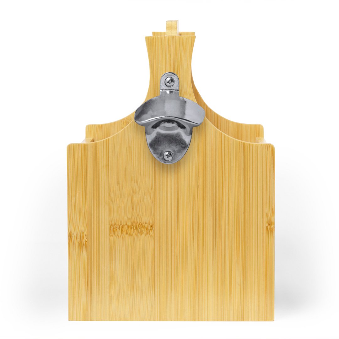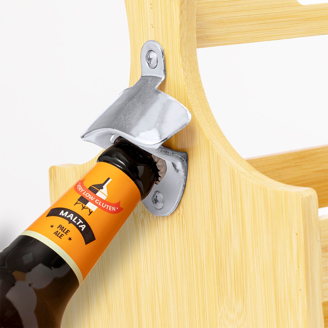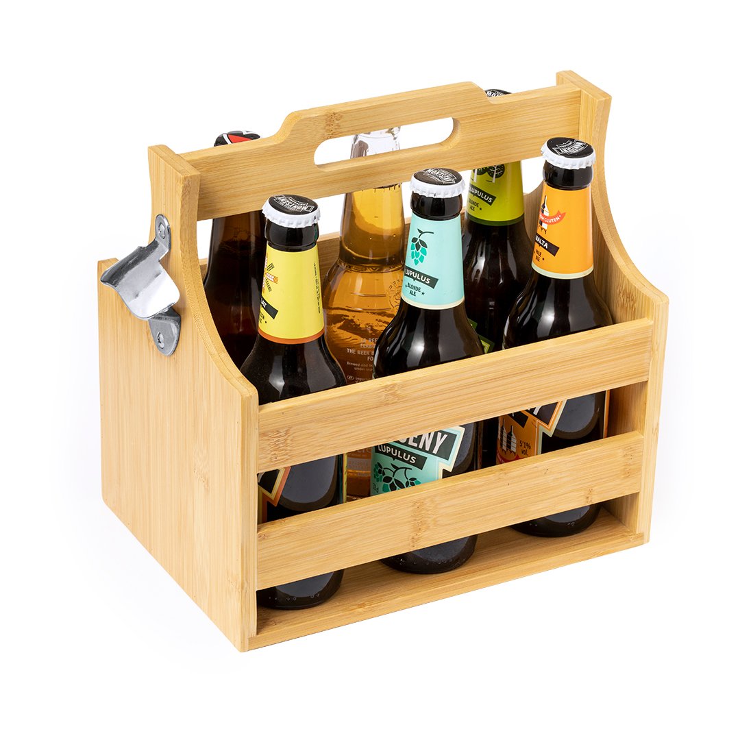 Práctico soporte para botellas hecho en bambú. Original caja de transporte de bebidas con asa troquelada en la parte superior y un abridor de botellas metálico en un lateral, con capacidad para 6 botellines. Presentado en caja de diseño kraft.