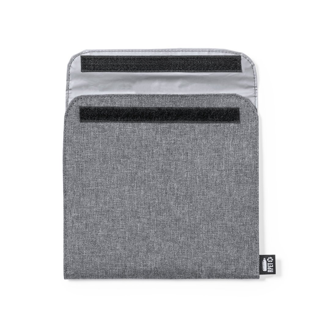 Portasnacks térmico de línea nature. Exterior fabricado en poliéster 600D RPET, elaborado a partir de plástico reciclado, para así fomentar la reutilización de residuos plásticos y ayudar a la sostenibilidad del planeta. Interior isotermo en PEVA, con cierre de velcro y etiqueta exterior con distintivo RPET.