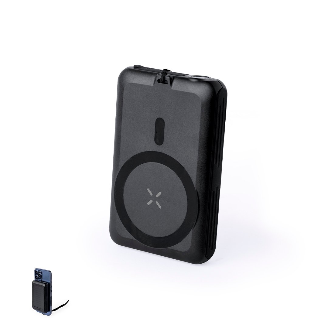 Batería auxiliar externa de recarga solar y de gran capacidad de carga -5.000 mAh-. Con cargador inalámbrico integrado 5W y fijación magnética Magsafe, permitiendo usar el dispositivo mientras se está cargando y compatible con dispositivos equipados con tecnología de carga inalámbrica Qi. Además, cuenta con una luz LED con dos posiciones de luz, fija e intermitente. Fabricada en resistente ABS de color negro, con conector de entrada/salida Tipo C + 1 salida USB + 1 entrada Micro USB. Presentada en atractiva caja individual de diseño.Las capacidades mostradas en todas nuestras baterías auxiliares externas son reales, incorporando todas ellas baterías de grado A y no recicladas, con una vida útil de al menos 500 ciclos de carga y según normativa CE. Además, están fabricadas conforme a los estándares RoHS y en cumplimiento con los siguientes requisitos de seguridad:Sistema de protección contra sobrecarga del power bank.Sistema de protección contra descarga completa que proporciona una mayor durabilidad del power bank.Sistema de bloqueo para evitar cortocircuitos.Sistema de transferencia de carga constante, acorde con la capacidad del dispositivo de destino.