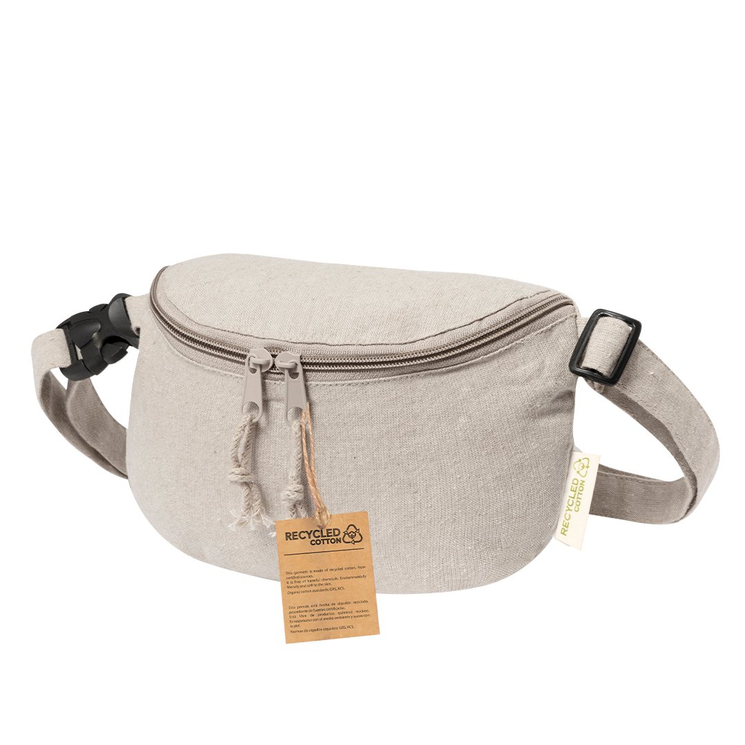 Riñonera fabricada en algodón 100% reciclado GRS de 220g/m2. Cuenta con un bolsillo central con cierre de doble cremallera y una cinta ajustable con cierre de clip. Disponible en una variada gama de colores y con logotipo algodón reciclado en la etiqueta exterior. Disponible certificación GRS (Global Recycled Standard / Estándar de Reciclaje Global), que garantiza el origen reciclado del material usado para fabricar el producto.