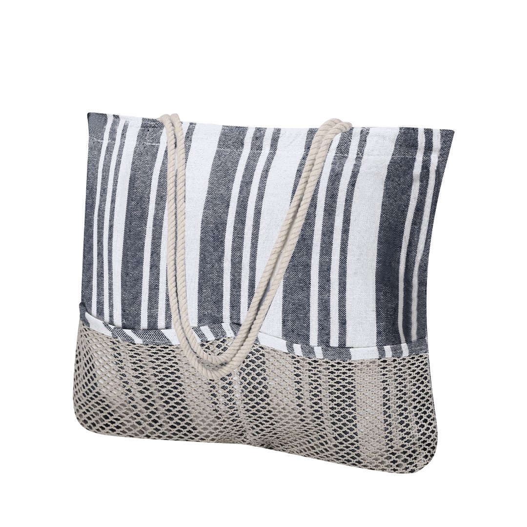 Set bolsa, neceser y pareo fabricado principalmente en algodón 180 g/m². Diseño de rayas con diferentes grosores. Ideal para escapadas vacacionales. Bolsa con 2 bolsillos frontales de malla, con fuelle y asas en cordón de algodón trenzado. Suave pareo en combinación. Su diseño cuenta con una base en color y rayas blancas a conjunto con la bolsa. Incluye flecos en los extremos que añaden un detalle decorativo y que completan su acabado.Neceser con compartimento principal de cierre de cremallera.