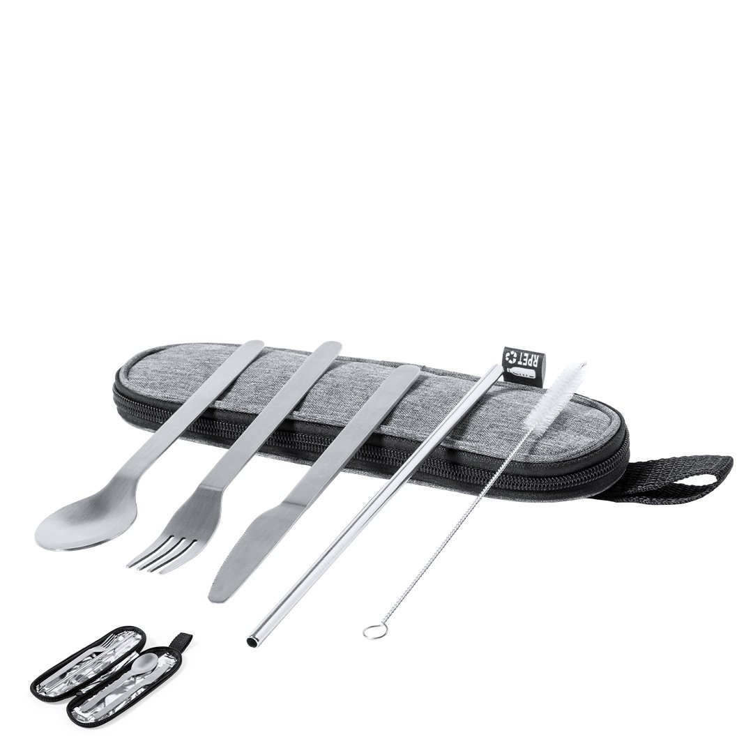 Set de cubiertos reutilizables fabricados en resistente y duradero acero inox. Incluye cuchara, cuchillo, tenedor, pajita y accesorio de limpieza. Presentados en elegante estuche individual de poliéster 300D RPET, elaborado a partir de plástico reciclado para así fomentar la reutilización de residuos plásticos y ayudar a la sostenibilidad del planeta. Estuche con cinta de transporte, cierre de cremallera y distintivo RPET en etiqueta.