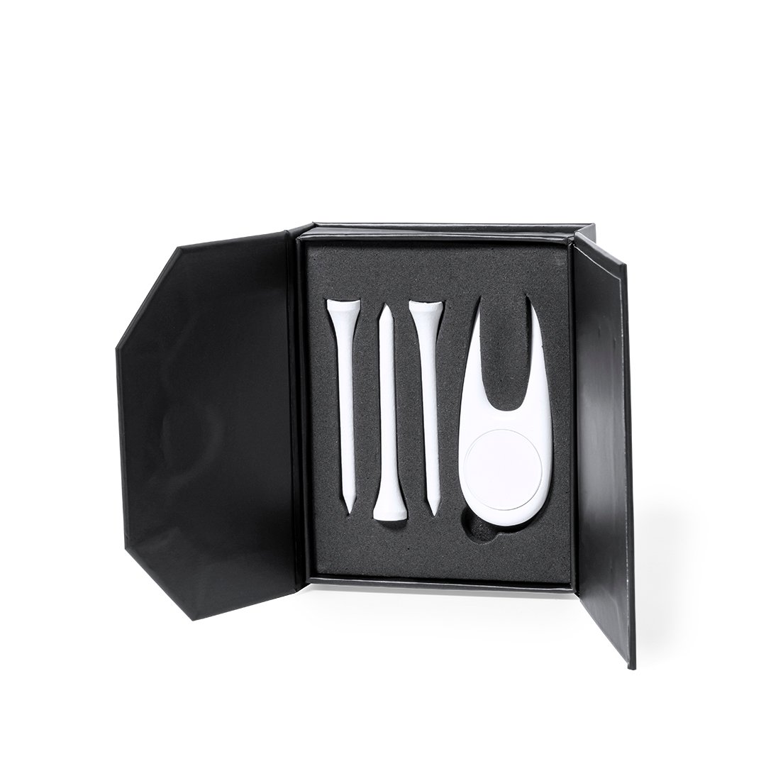 Set de golf de cuatro accesorios en elegante acabado de color blanco. Incluye divot metálico con troquelado especial para doming/gota de resina y 3 tees de madera. Presentado en sobrio estuche individual con interior troquelado y cierre de imán.