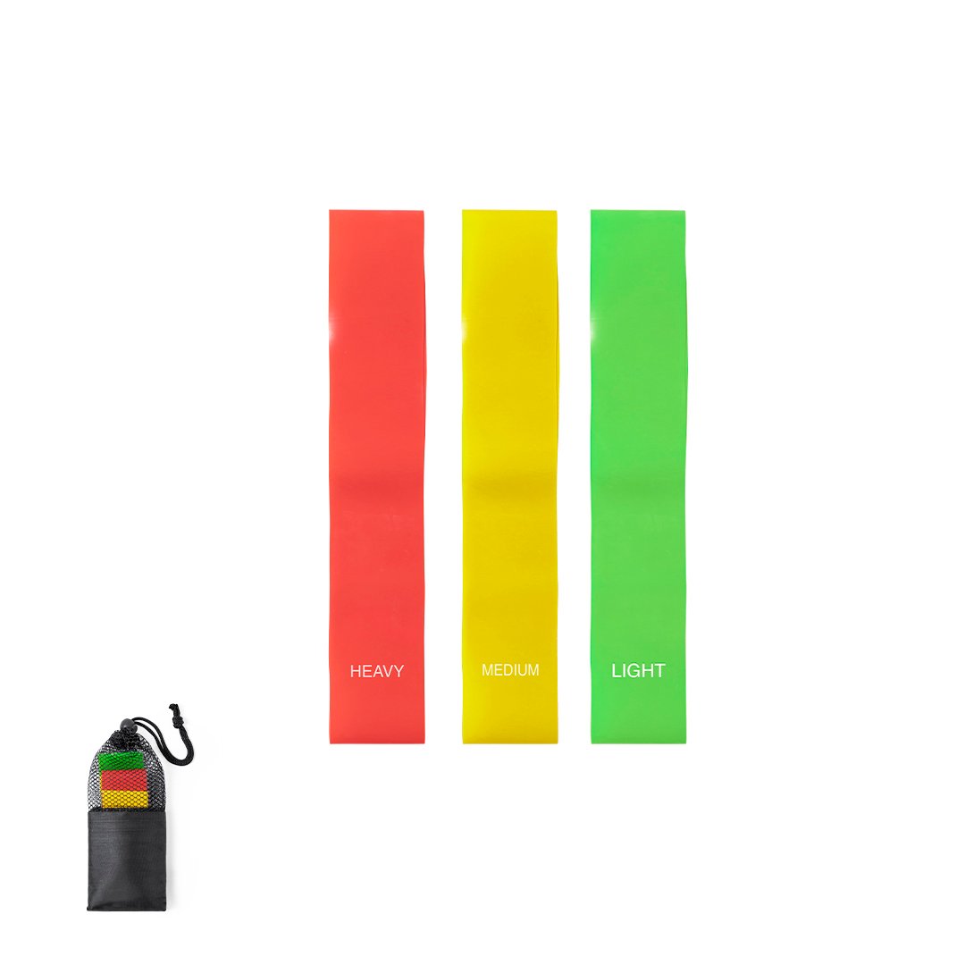 Set de gomas elásticas para los más deportistas. Incluye 3 cintas de 30×5 cm, fabricadas en resistente material TPE y 3 niveles de resistencia: ligera, media y fuerte. Presentado en funda de poliéster con cierre de cordón y accesorio de ajuste.