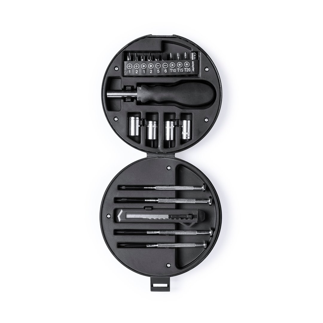 Set de herramientas de 20 accesorios en resistente estuche con diseño de rueda. Incluye set de destornilladores de precisión, herramienta de fijación, cabezales destornilladores planos y de estrella, llaves para tuercas de cabeza hexagonal y cutter. Presentado en caja individual.