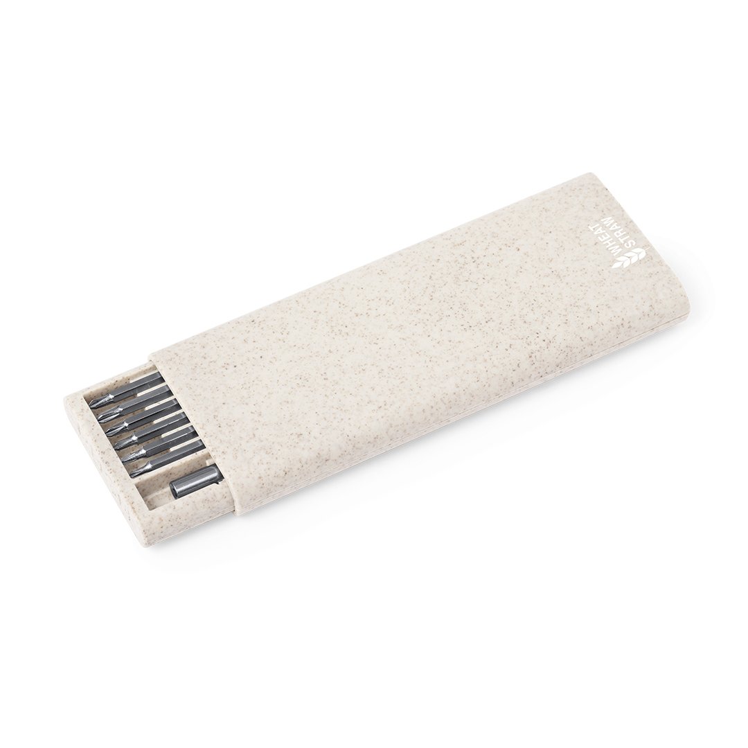 Práctico set de herramientas fabricado en caña de trigo y troquelado interior para un perfecto ajuste. Incluye un destornillador de precisión con 24 accesorios, compuesto por diversas puntas: philips, allen y planas. Con logotipo caña de trigo incluido. Presentado individualmente en caja de diseño kraft. La caña de trigo fomenta la utilización de materias primas naturales, reduciendo así las emisiones contaminantes.