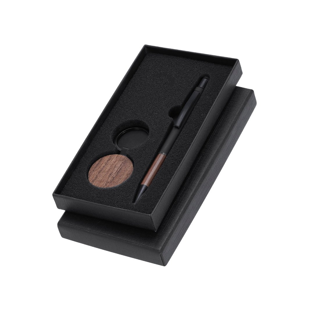 Elegante set en madera de nogal y detalles metálicos en negro mate. Incluye:-Bolígrafo de acabado negro mate y detalles en madera de nogal. Con mecanismo pulsador y tinta azul.-Llavero en madera de nogal y accesorios metálicos con acabado en negro mate.Presentado en estuche individual negro.