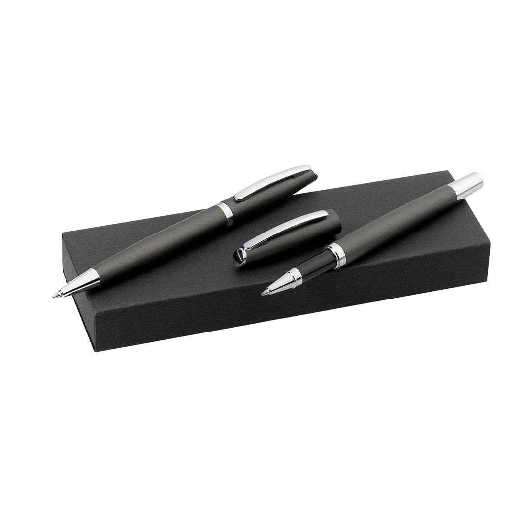 Elegante set de bolígrafo de mecanismo giratorio y roller de capucha en sobrio diseño. De cuerpo de aluminio en suave acabado con accesorios en colores plateados. Presentado en estuche individual de cartón con funda en color negro. Bolígrafo con cartucho jumbo. En tinta azul.