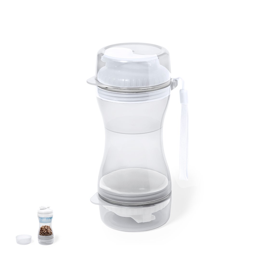Práctico set de mascotas fabricado en resistente ABS. Con dos compartimentos separados de 330 ml y 280 ml, con tapón de rosca para mayor seguridad y dosificadores incluidos. Además, cuenta con dos tapaderas para usar como cuenco. Presentado individualmente en caja de diseño kraft.