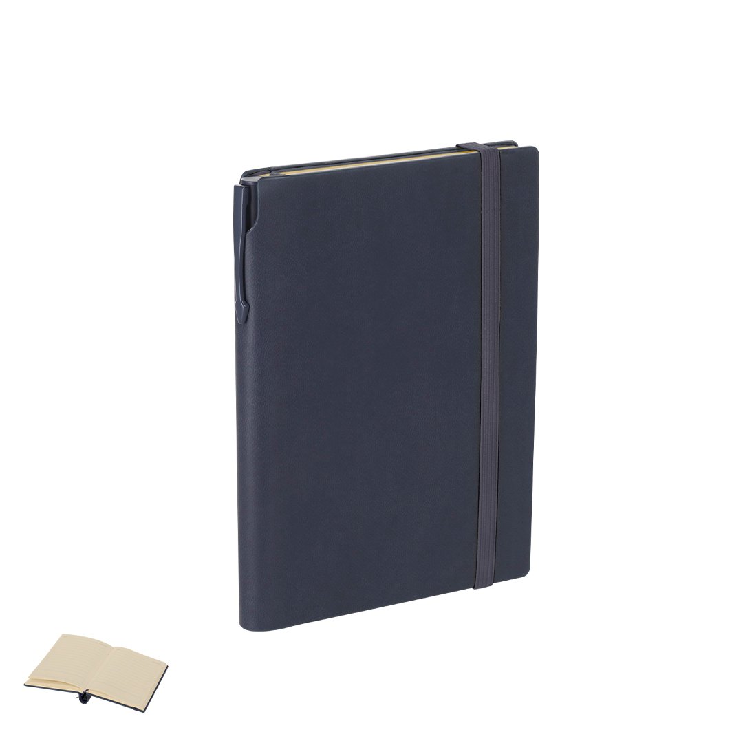 Set de bloc de notas y bolígrafo fabricados en PU reciclado y Aluminio Reciclado. El set incluye: – Bloc de notas fabricado en PU reciclada. Portadas rígidas, incluye 96 páginas de color crema, marcapáginas y cinta elástica de cierre a juego. Con distintivo logo PU reciclado. – Bolígrafo fabricado en Aluminio reciclado, con cuerpo en color sólido en acabado caucho. Dispone de clip, mecanismo pulsador y tinta azul. Incluye distintivo logo en Aluminio reciclado.El bloc dispone de un espacio para guardar el bolígrafo pudiendo llevarlo todo en un mismo sitio.