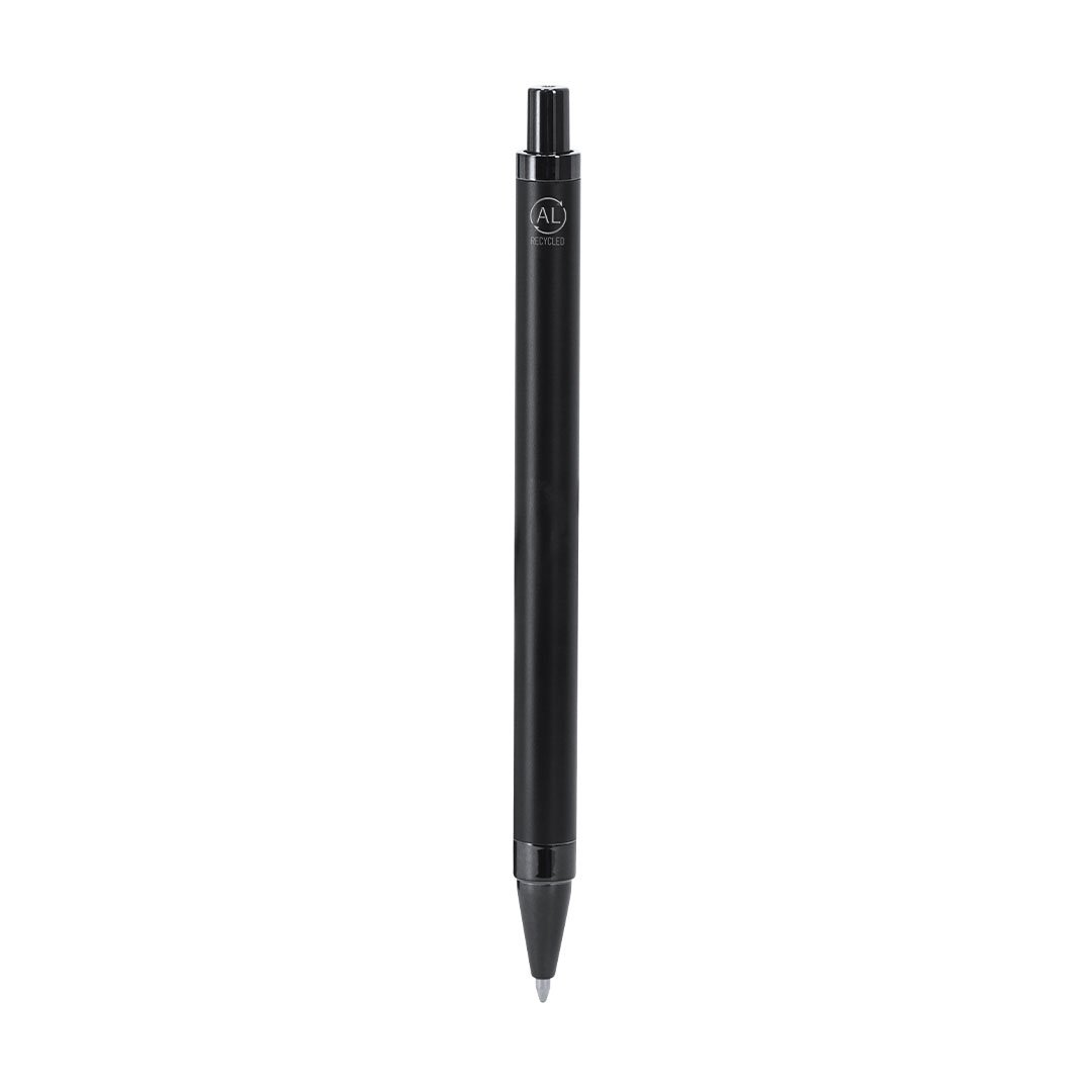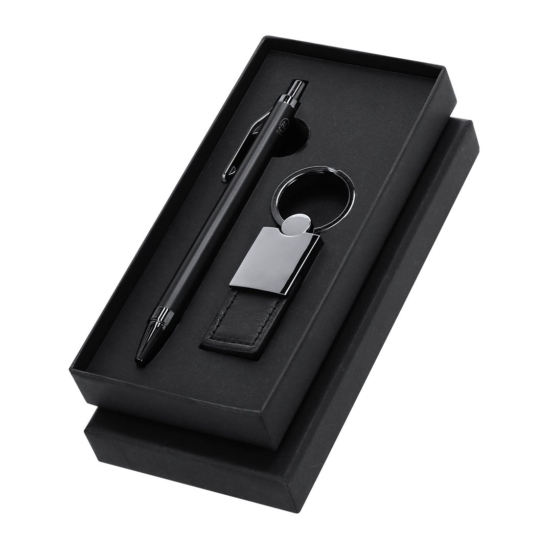 Elegante set premium que incluye:Bolígrafo en Aluminio Reciclado de acabado negro mate, de mecanismo pulsador y tinta azul. Con clip y puntera en pulido ABS. Incluye distintivo Aluminio reciclado.Elegante llavero con cinta fabricada en poliéster PU y accesorios cromados.