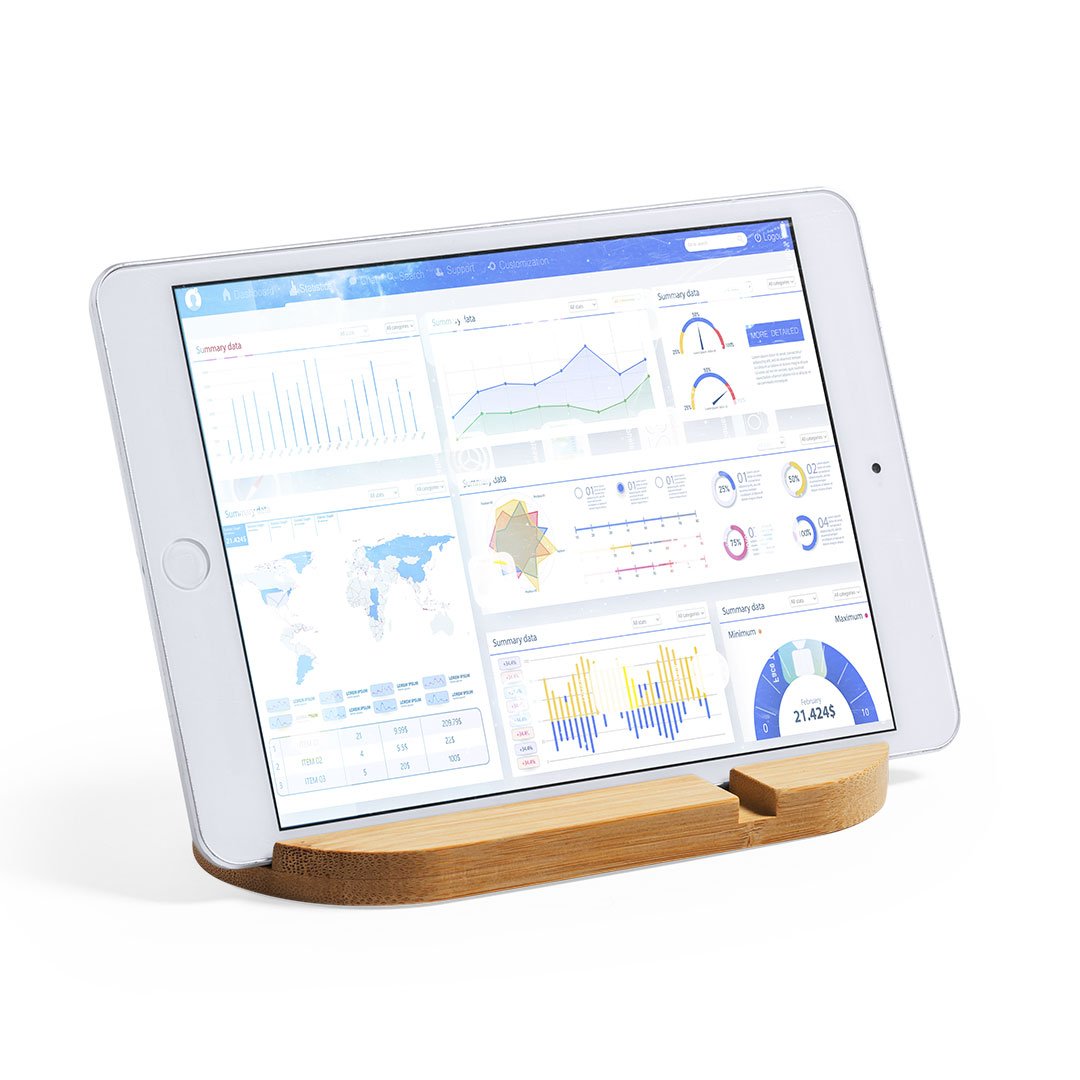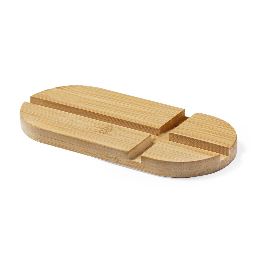 Original y sencillo soporte de línea nature para smartphone y tablet. Fabricado en bambú procedente de cortes naturales. Presentado en atractiva caja individual de diseño eco.