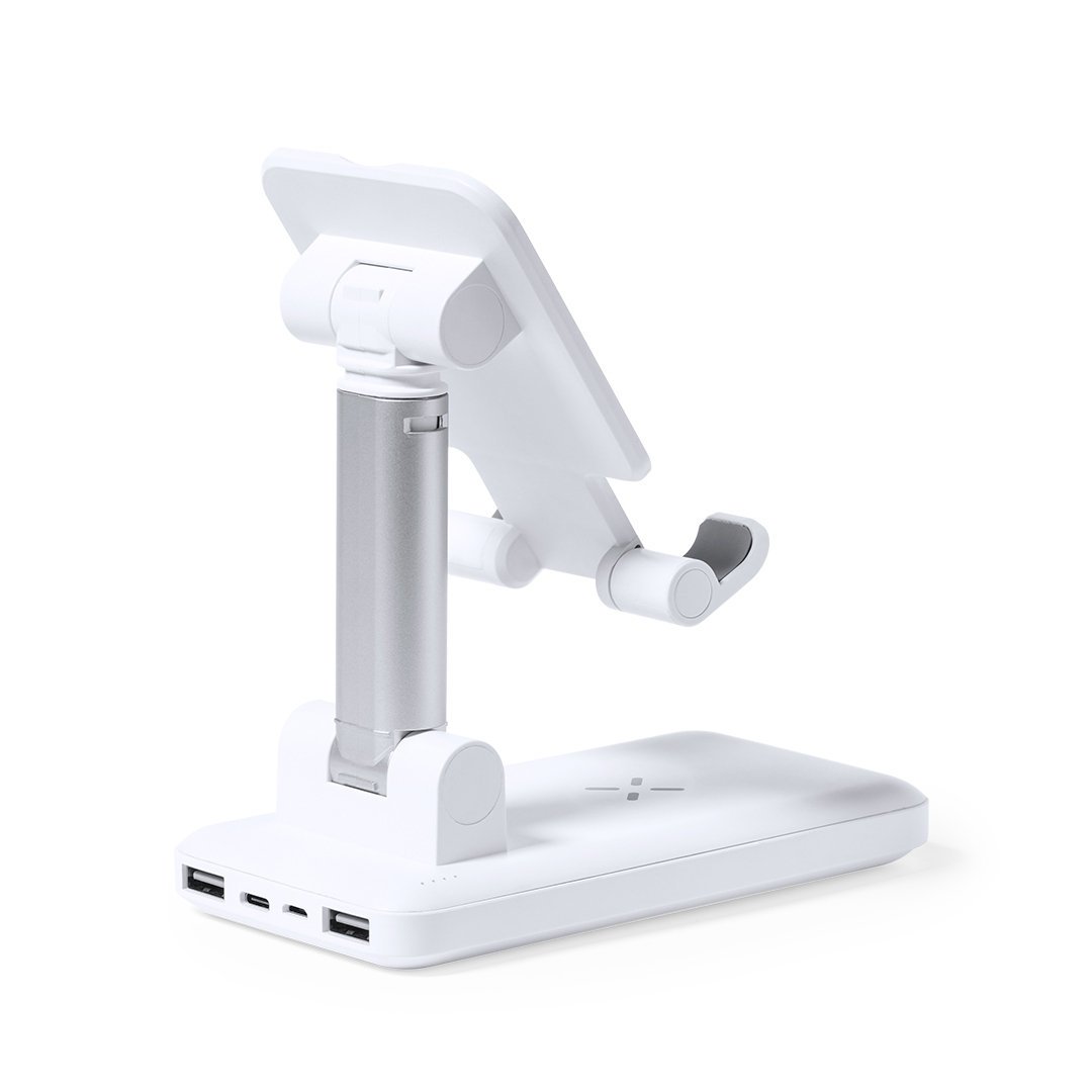 Cargador Inalámbrico 10W. Power Bank 5000 mAh. 2 Salidas USB y 1 Tipo C. Entrada Micro USB y Tipo C. Plegable. Altura y Ángulo Regulable.