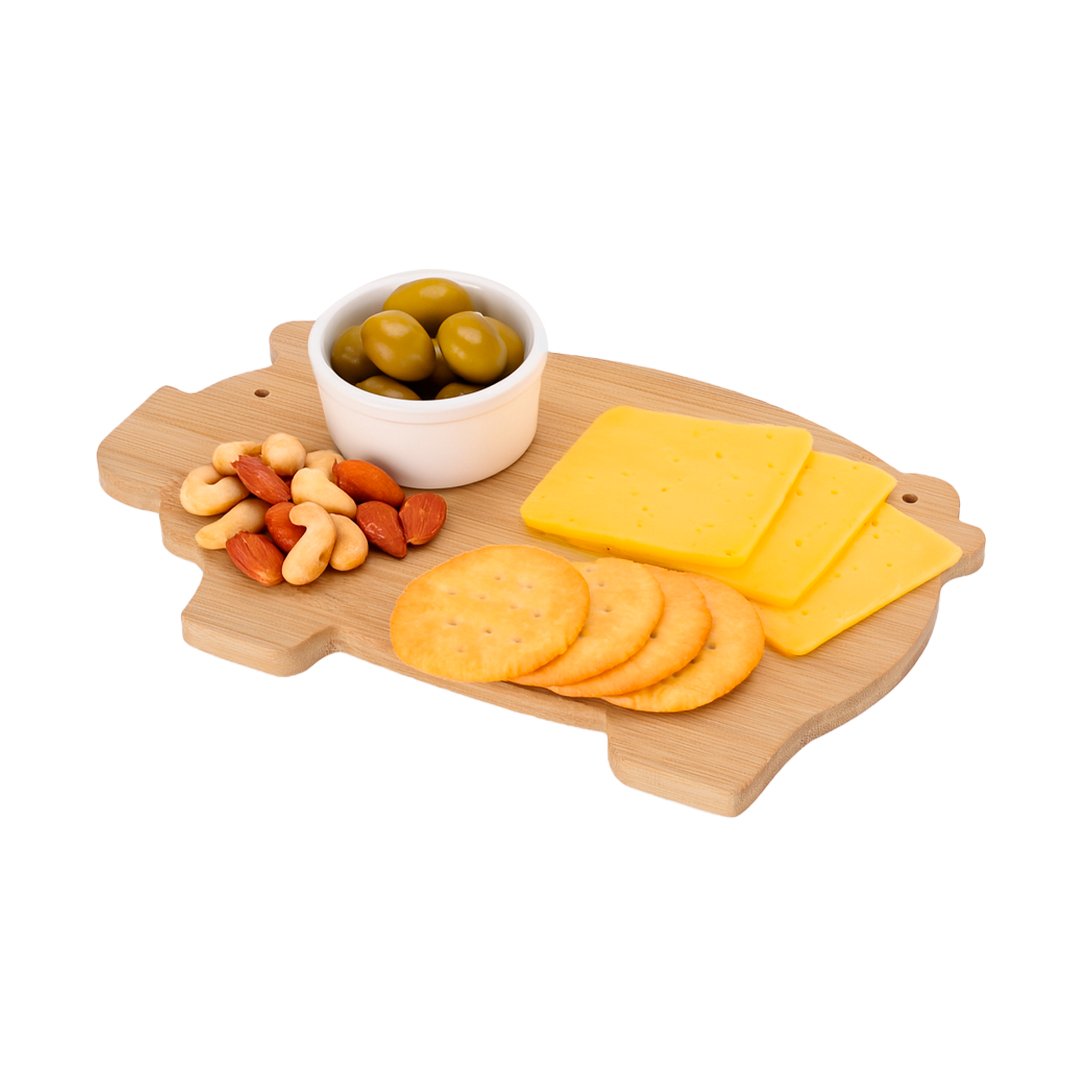 Tabla de cocina con original diseño en forma de cerdito, fabricada en suave bambú y con agujero para colgar, muy fácil de limpiar y guardar.