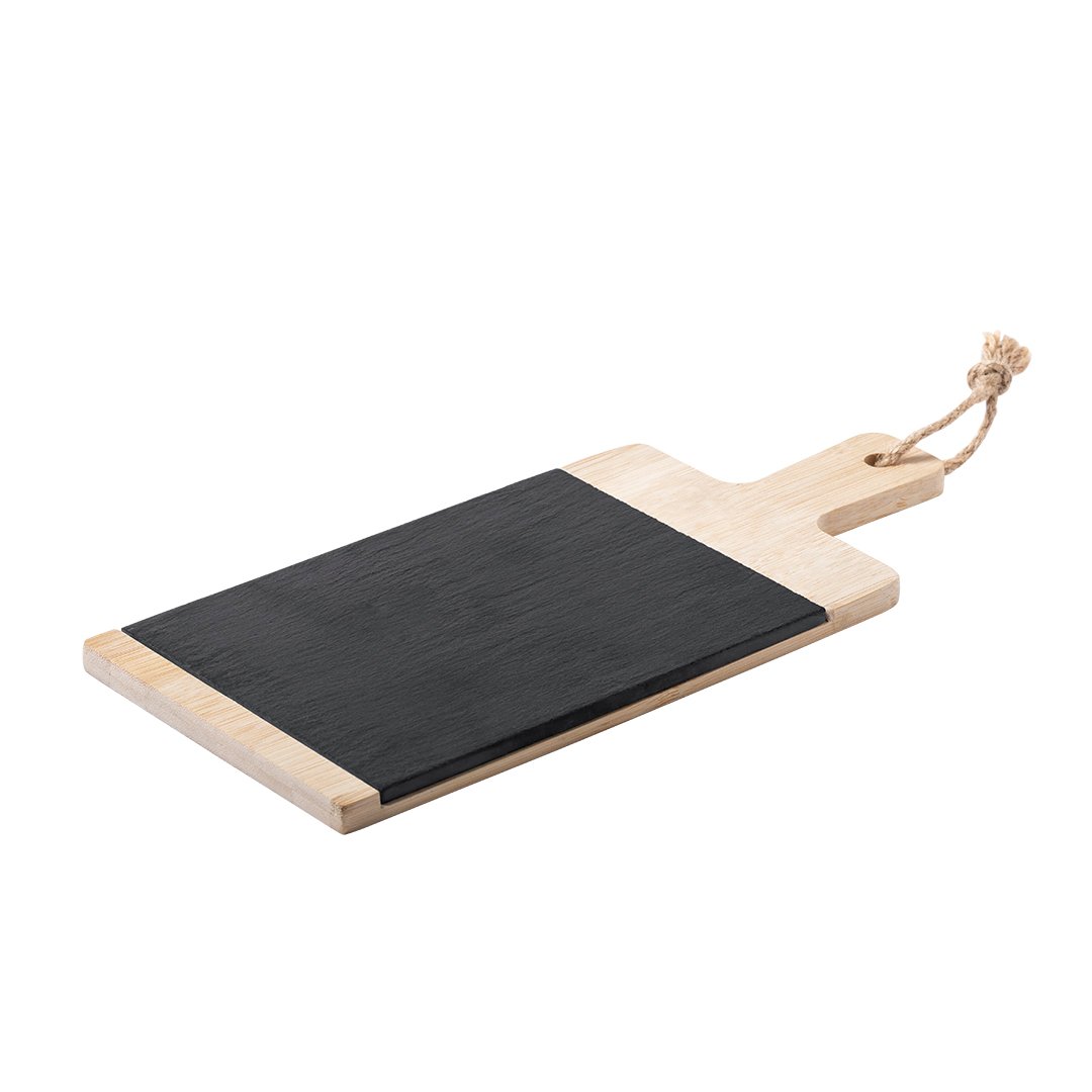 Tabla fabricada en combinación de materiales bambú y pizarra, de suave y resistente acabado pulido. Ideal para corte y presentación. Con asa para fácil manejo y cordón para colgar. Tabla de pizarra extraíble para fácil limpieza. Presentada en atractiva caja individual de diseño eco.