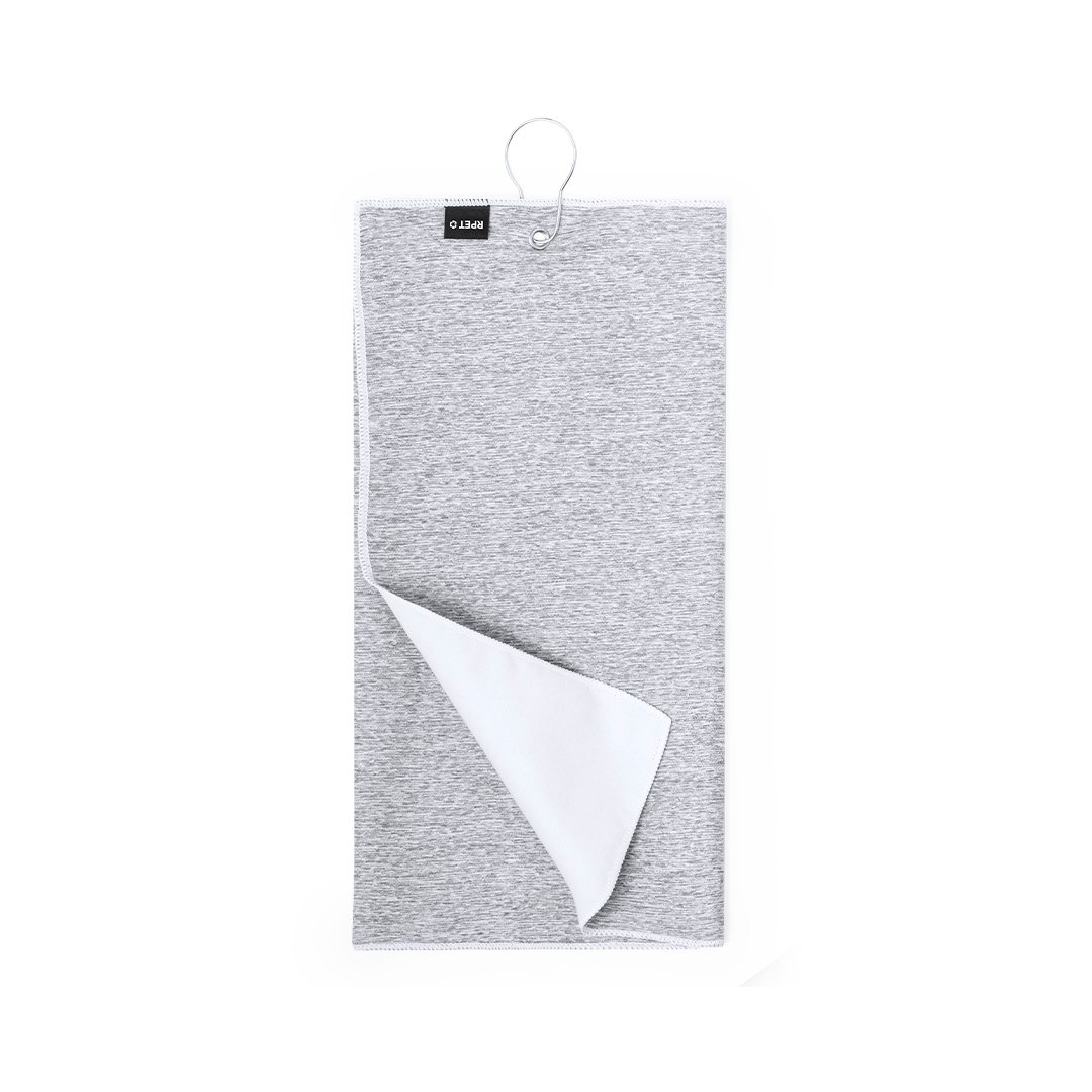 Toalla de golf fabricada en RPET, absorbente y suave con dimensiones de 40×60 cm. En el centro, incorpora una argolla reforzada y un mosquetón de acople, ambos elaborados en acero inox. Con logotipo RPET en etiqueta.El material RPET se elabora a partir de plástico reciclado, para así fomentar la reutilización de residuos plásticos y ayudar a la sostenibilidad del planeta.